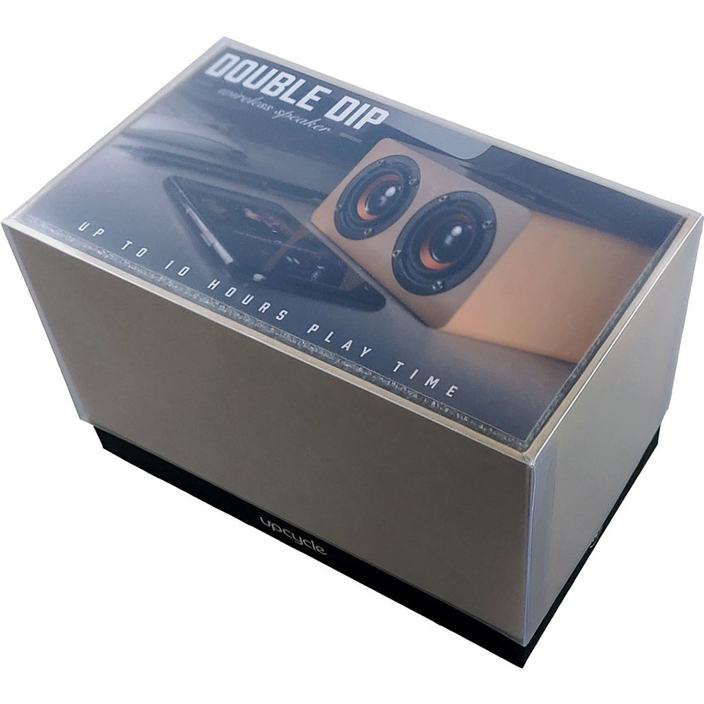 The Double Dip is a wireless speaker that works up to 25 feet from your connected device. Featuring built-in dual woofers, this speaker provides great sounds quality and a classy look. Wireless speaker. 3-hour charge time provides 10 hours of listening. Available in rich, wood-look finish. We really appreciate you being here. Price includes one color, one location imprint.