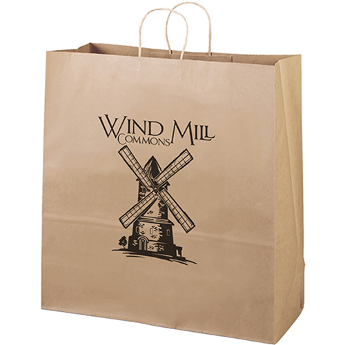 This eco-friendly brown kraft-paper shopper features matching twisted paper handles and serrated cut top. Made from 100% recycled paper with a minimum of 60% post-consumer content. Price includes a one color, one location imprint. Free Proof prior to production.