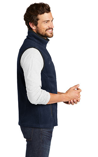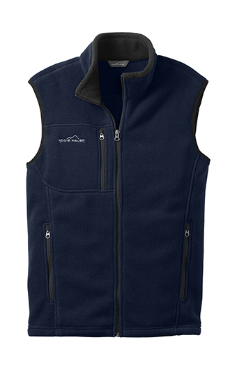 Ward off early morning chills by insulating your core with this soft, cozy vest. Contrast rolled top collar, zippered chest pocket, reverse coil contrast zippers, front zippered pockets with tricot lining, binding at armholes and an open hem. Contrast Eddie Bauer logo embroidered on right chest. Made of 12-ounce, 100% polyester fleece which incorporates Low Impact Technology for enhanced softness and performance. Price includes embroidery in one location in up to 6 thread colors & 8,000 stitches.