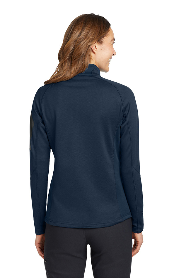 Smooth-faced fleece with a subtle grey print gives this 1/2-zip a sleek performance look. Reverse coil zipper, open cuffs and an open hem. Princess seams, welded zippered left sleeve pocket, contrast Eddie Bauer heat transfer logo on right hem. Made of 7.7-ounce, 95/5 poly/spandex. Price includes embroidery up to 5k stitches.