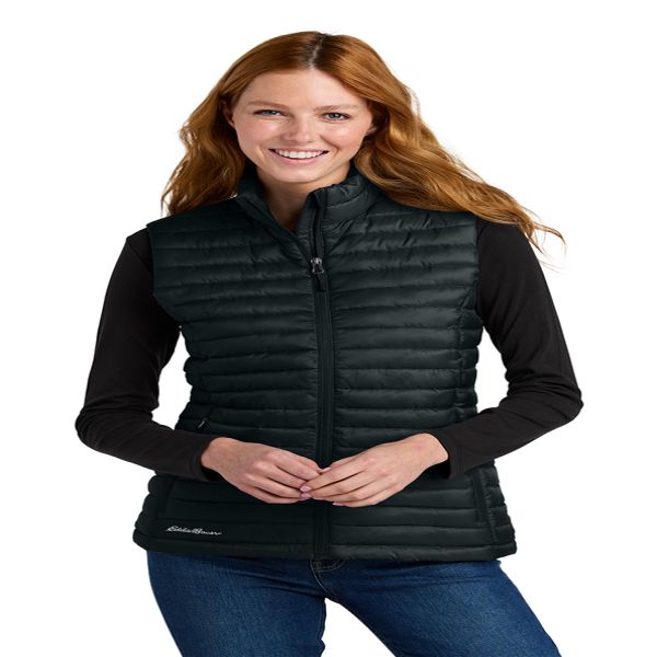 Designed with traditional quilt lines, this insulated vest is built for warmth and weather-resistant performance. Features include full-length interior storm flap with chin guard, exposed, molded zippers with Eddie Bauer logo pulls, zippered hand pockets and a slight drop tail hem. Includes an embroidery access pocket. Packs into zippered left hand pocket. Contrast Eddie Bauer heat transfer logo on right hem. Made of 100% polyester ripstop and 3-ounce, 100% polyester blown fill. PU coating on back of shell. Durable water-repellent (DWR) finish. Price includes embroidery.