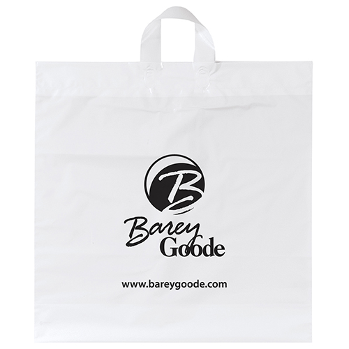 The Elephant is a lo-density 3.25 mil plastic bag that features fused soft-loop handles, a reinforced fold-over top, and bottom gusset.