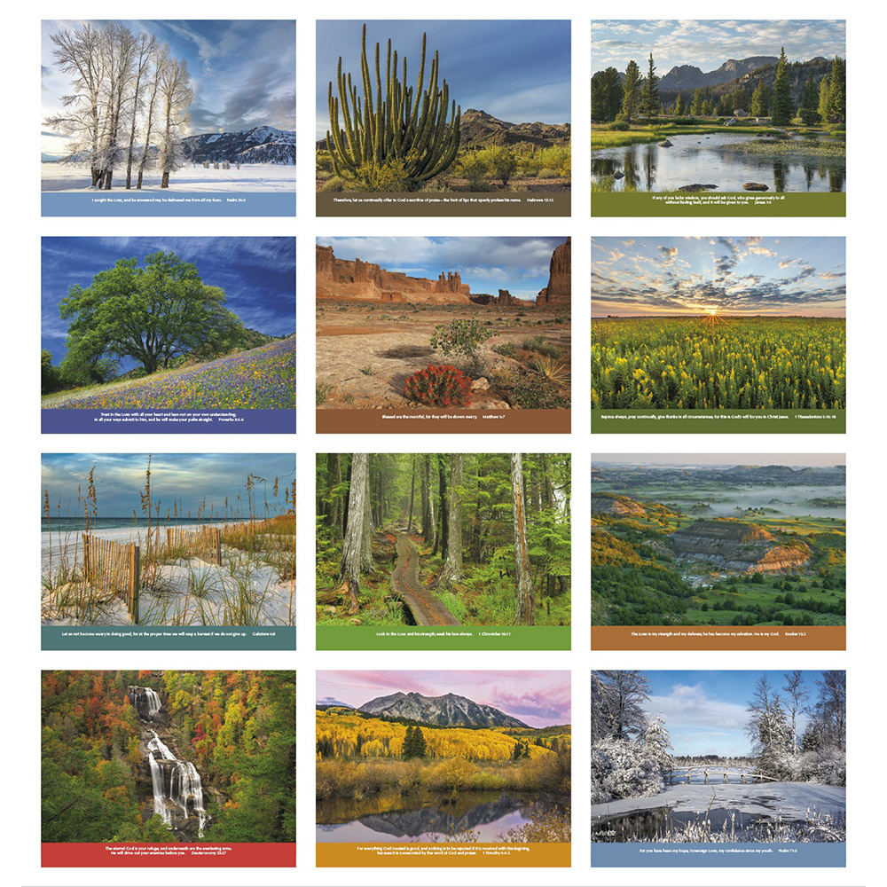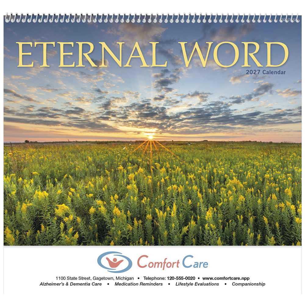 This 12-month calendar features Bible verses from the New International Version, with a funeral pre-planning form. 12-month calendar with funeral planning form. Gloss Paper Stock with UV Coated Cover. High-quality Imagery. Top markets: religious, insurance, general services. Price includes 1 color imprint.