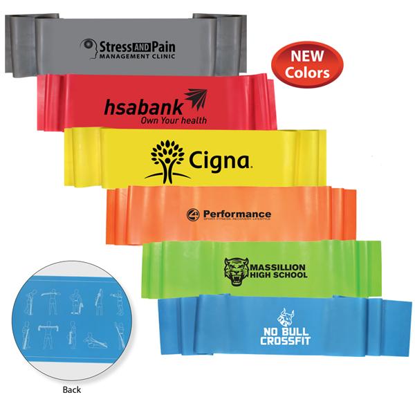 10 Example Exercises Printed on Back of Band. Latex Material. Black and White Ink Only. Price includes one color, one location imprint.