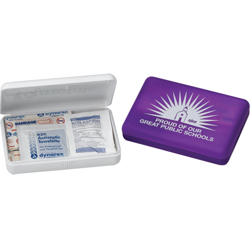 This handy little first aid kit is a gift that everyone will appreciate. The kit comes fully stocked with 4 standard sized bandages, 2 antiseptic wipes and non-aspirin. The plastic case has a large imprint area for your company logo or other message. Price includes a one color imprint, one location.