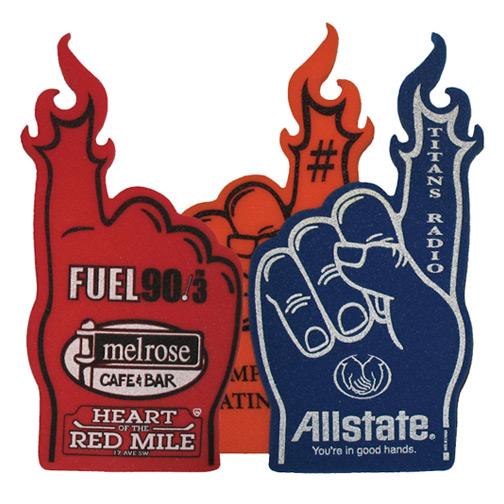Ignite your promotional campaign with burning passion! Try this foam flame finger hand cheering novelty when you want your campaign to catch fire. It's silkscreen imprinted or with full color heat transfer and in various colors. Have your logo or message silkscreened on the hand, and let the flaming finger cheer for victory! Perfect for sports events or pep rallies. Let your customers know they are number one! Price includes 1 color imprint, 1 location.