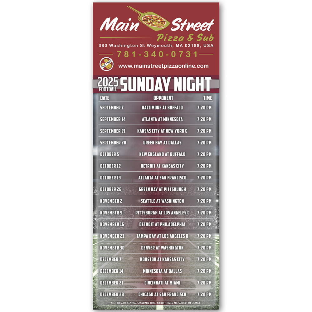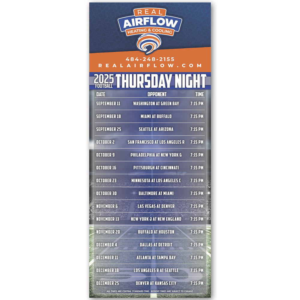 Now offering dual football schedules that are available with all professional and college teams! Sports are a big part of any community, by adding your company name and logo to a 3 1/2 x 8 1/2 football themed schedule magnet you can show your support for local teams and your neighbors as well. Always-in-stock with an approximate 0.020 material thickness, these customizable marketing tools are great for corporate sponsorships. Price includes full color imprint.