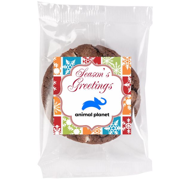Fresh-baked gourmet cookie is ideal for tradeshows, employee recognition, mug stuffers, hotel turndowns, gift baskets and more! Cookies come individually wrapped for easy sharing and freshness! Cookies are non-melt and have a 3 month shelf life. Price includes full color imprint.