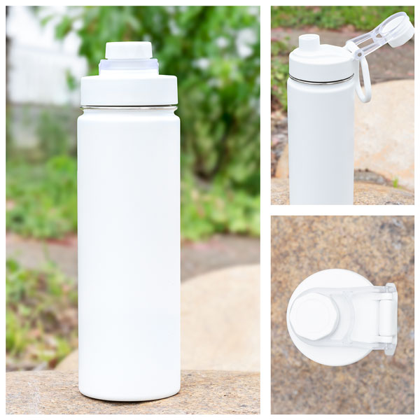 24 oz double wall 18/8 stainless steel thermal bottle with copper vacuum insulation, matching threaded lid, drinking spout, hinged cap, carrying handle, and powder coated finish · gift box included