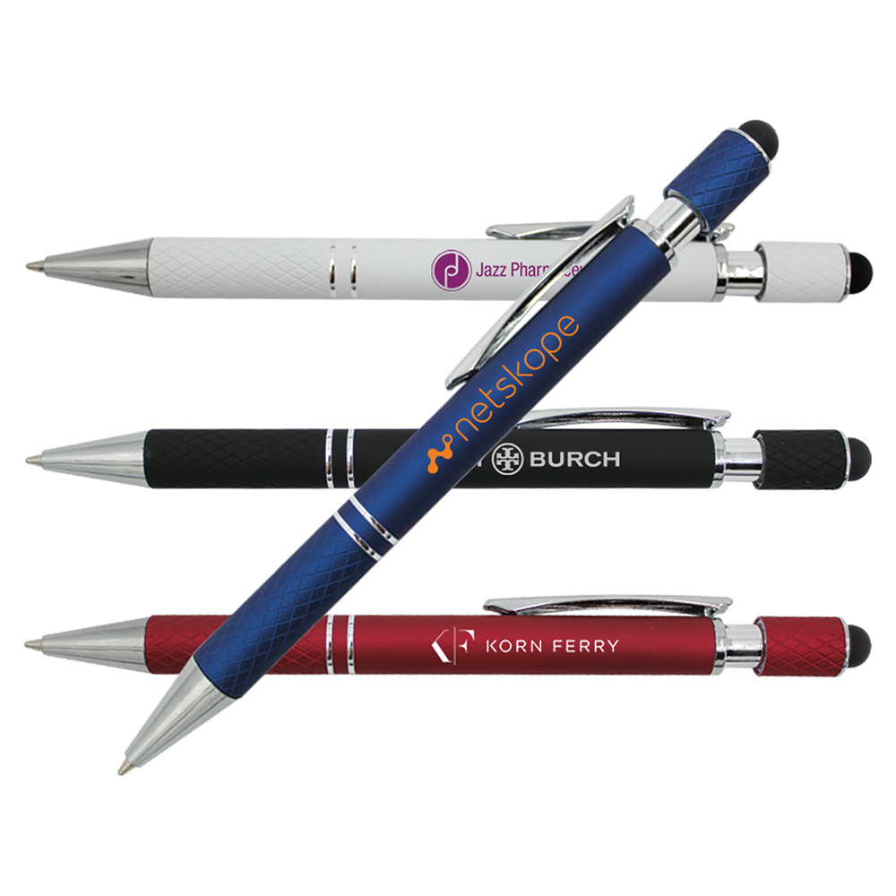 Model: 16055 Halcyon Executive Metal Spin Top Pen with Stylus View Imprint Area Product Description Sleek soft touch feel barrels. Fidget spin top plunger with stylus tip. Criss cross pattern on grip and spin top. Retractable pen with chrome accents. Black ink.Price includes one color, one location imprint. Free proof prior to Production. Imprint Area: 0.33"h x 1.75"w Request A Virtual Proof Select Color Red Blue White Black Choose Quantity View Price Breaks Quantity Price 150 $2.35 250 $2.21 500 $2.06 1000 $1.98 2500 $1.91 Enter quantity or drag slider. Minimum quantity is 150. Quantity: Price Each $2.35 Setup Charge: $0.00 Subtotal $352.50 Savings: $ over minimum qty pricing Choose Your Quantity Quantity Price 150 $2.35 250 $2.21 500 $2.06 1000 $1.98 2500 $1.91 Standard Production Time: 7 business days Select Delivery Date Enter ZIP Code Apply Loading... Choose a Shipping Method -- Loading Shipping Prices -- Customize it! Upload Your Art Now Or Send it Later. Select Imprint Location and Color(s) Back to Edit Product Color And Quantity Where on the item should we print your design? 1.75" x 0.33" Zoom Available print design areas 1.75" x 0.33" Zoom What imprint Color(s) would you like? (Maximum # of Imprint Colors: 1) White Tan Medium Brown Sienna Brown Violet Purple Lilac Navy Blue Royal Blue Carolina Blue Teal Kelly Green Forest Green Olive Green Gray Black Lemon Yellow Golden Yellow Vegas Gold Citris Orange True Orange Burnt Orange Bright Red Scarlet Red Burgundy Hot Pink Ribbon Pink Pastel Pink White Tan Medium Brown Sienna Brown Violet Purple Lilac Navy Blue Royal Blue Carolina Blue Teal Kelly Green Forest Green Olive Green Gray Black Lemon Yellow Golden Yellow Vegas Gold Citris Orange True Orange Burnt Orange Bright Red Scarlet Red Burgundy Hot Pink Ribbon Pink Pastel Pink Add Additional Imprint Location Product Color: Select product color Quantity: 150 Add Your Artwork Add Artwork Add Now Send After Checkout Don’t have artwork? That’s ok! Artwork is not required to start a job. Simply skip this step and email us artwork later (helpdesk@claytonkendall.com). If you need assistance with your art, our designers can help with that too! Will I be able to approve my design before it goes into print? Yes! You will receive a digital mock-up of your artwork on this item within a few hours of placing your order. We will send your order into production only after you approve the mock-up. Only Image Aa Only Text Aa Text/Image Designer Contact Us Enter Your Text Choose file Uploading logo. Please wait... Personalize your design by adding text and customizing its shape with a curve. Upload your logo to give it a professional touch, and combine these elements to create a one-of-a-kind design that’s uniquely yours. Open Product Designer Don’t have artwork? That’s ok! Artwork is not required to start a job. Simply skip this step and email us artwork later. If you need assistance with your art, our designers can help with that too! Will I be able to approve my design before it goes into print? Yes! You will receive a digital mock-up of your artwork on this item within a few hours of placing your order. We will send your order into production only after you approve the mock-up. Free art proof will be emailed with every order within one business day Total (loading...) qty x Set Up Shipping Cost Rush Charge Custom Fields Hazmat Fee Estimate arrival Savings Add to Cart Updating Price...