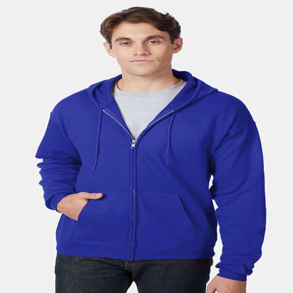 7.8 oz. 50% cotton (up to 7.7% reclaimed), 50% polyester (up to 7.7% recycled). Recycled polyester from plastic water bottles. Patented, low pill, high-stitch density PrintPro XP fabric. Single-ply hood. Dyed-to-match drawcord. Triple-needle top coverstitching along cuffs, waistband, pockets and hood. Full-zip front with pockets; rib knit waistband and cuffs. Tag-free neck label transitioning to tear-away label. INVENTORY MAY BE MIXED. "A" list status from CDP (Carbon Disclosure Project). Energy Star Partner of the Year (12 consecutive years). Every piece of Hanes apparel purchased from our company qualifies for Hanes4Education. Price includes embroidery up to 5k stitches.