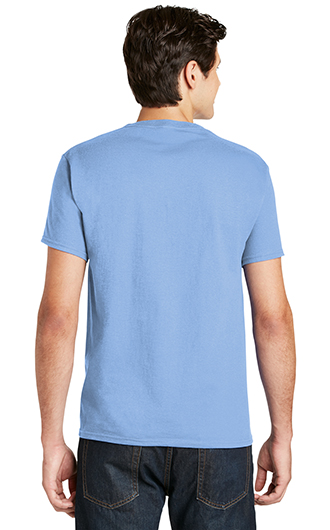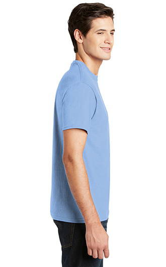 5.2-ounce, 100% ComfortSoft cotton (preshrunk). Double-needle coverseamed crewneck. Lay-flat collar. Tag-free label. Shoulder-to-shoulder taping. Double-needle sleeves and hem. Ash is 99/1 cotton/poly. Light Steel is 90/10 cotton/poly.