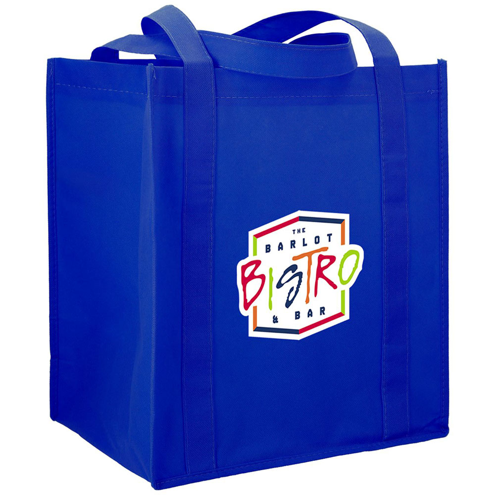 With its sturdy, reusable design, the Hercules Non-Woven Grocery Tote offers a sustainable alternative to plastic grocery bags. It has lightweight polypropylene construction, features durable 18.5" reinforced handles, and contains a supportive bottom board for added durability. Its spacious open main compartment is ideal for carrying groceries or personal items, such as books, clothing, and electronics. This tote was previously Leed's item 2150-38, Big Grocery Non-Woven Tote. Material: 80G non-woven polypropylene. Large open main compartment. Completely reusable to fight plastic waste. Sturdy reinforced 18.5" handles. Bottom board for added support.