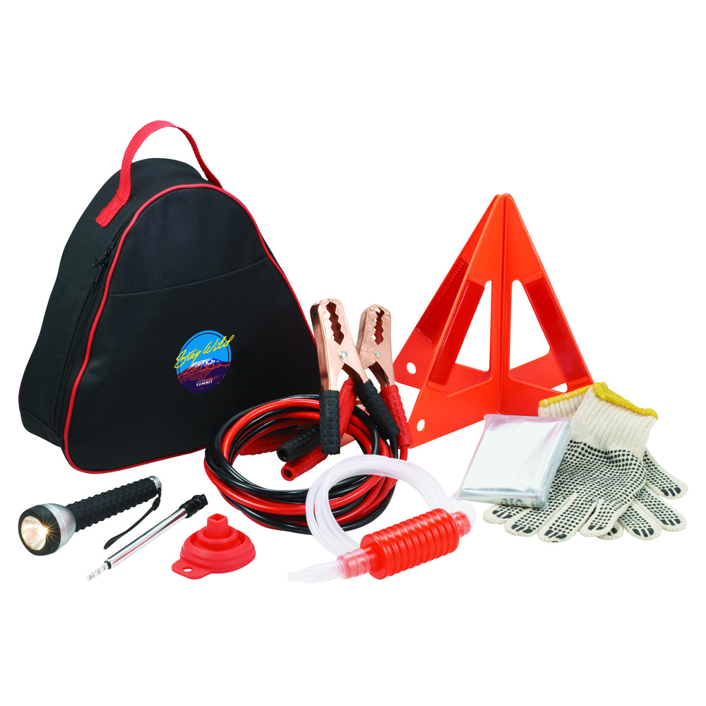 Handle all roadside emergencies with this 9 piece highway gift set. The durable 600D reflective carrying case includes: collapsible funnel, 10 gauge jumper cables, warning triangle, gas siphon, blanket, 50 PSI tire gauge, one pair of rubber grip gloves and flashlight with 2 AA batteries. Carrying case can be used as emergency reflective warning strip. Material: 600d Polycanvas.