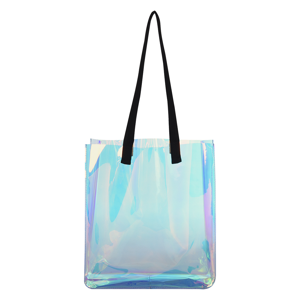 Made of Iridescent PVC Material. 26" Handles. 33/4" Gusset. Spot Clean/Air Dry.