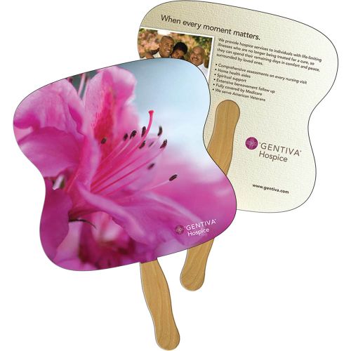 Film laminated on both sides for extra durability. LF-1 have wooden sticks, LF_1P have plastic sticks. Sticks are glued (not stapled) to fan back for safety and appearance. Put your logo in their hands, with a two sided,digitally printed in full color, high quality film laminated paper board, glued wooden stick hourglass shaped fan. Digital Econo Fans are printed in four color process, great for photographs. Hand fans act as mini billboards and are perfect for getting your custom message noticed at sports, trade shows, churches and much more. Film laminated on both sides. High density 22 pt. thickness. Quick turnaround available. Price includes full color imprint.