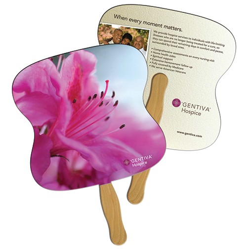 Hourglass shaped Fast Fan orders in by 12:00 CST, ships next day. Two-sided, digitally printed in full color, high quality, film laminated paper board, glued wooden stick for appearance. 22 pt. thickness. Printed in four color process, great for photographs. Hand fans act as mini billboards and are perfect for getting your custom message noticed at sports, trade shows, fund raisers, churches, restaurants, business & political events and much more. Price includes full color imprint.