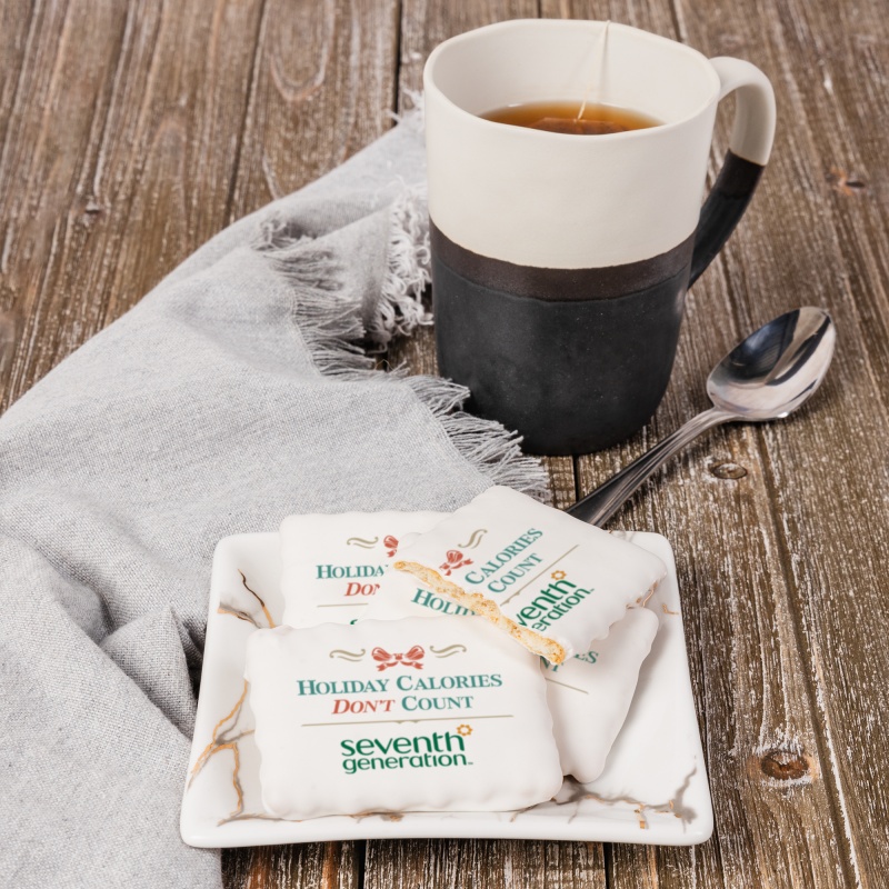 An irresistible blend of sweetness and sophistication. Rectangle Vanilla Wafer Cookies. Enrobed in Royal Icing. Printed with Edible Ink.Great for meetings & trade show tables. Cookies are non-melt and have a 6 month shelf life. Price includes full color imprint.