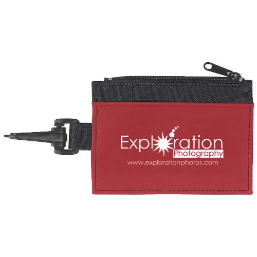 Zippered compartment with split ring. Clip for attachment. Pocket on backside. Price includes one color imprint, one location.