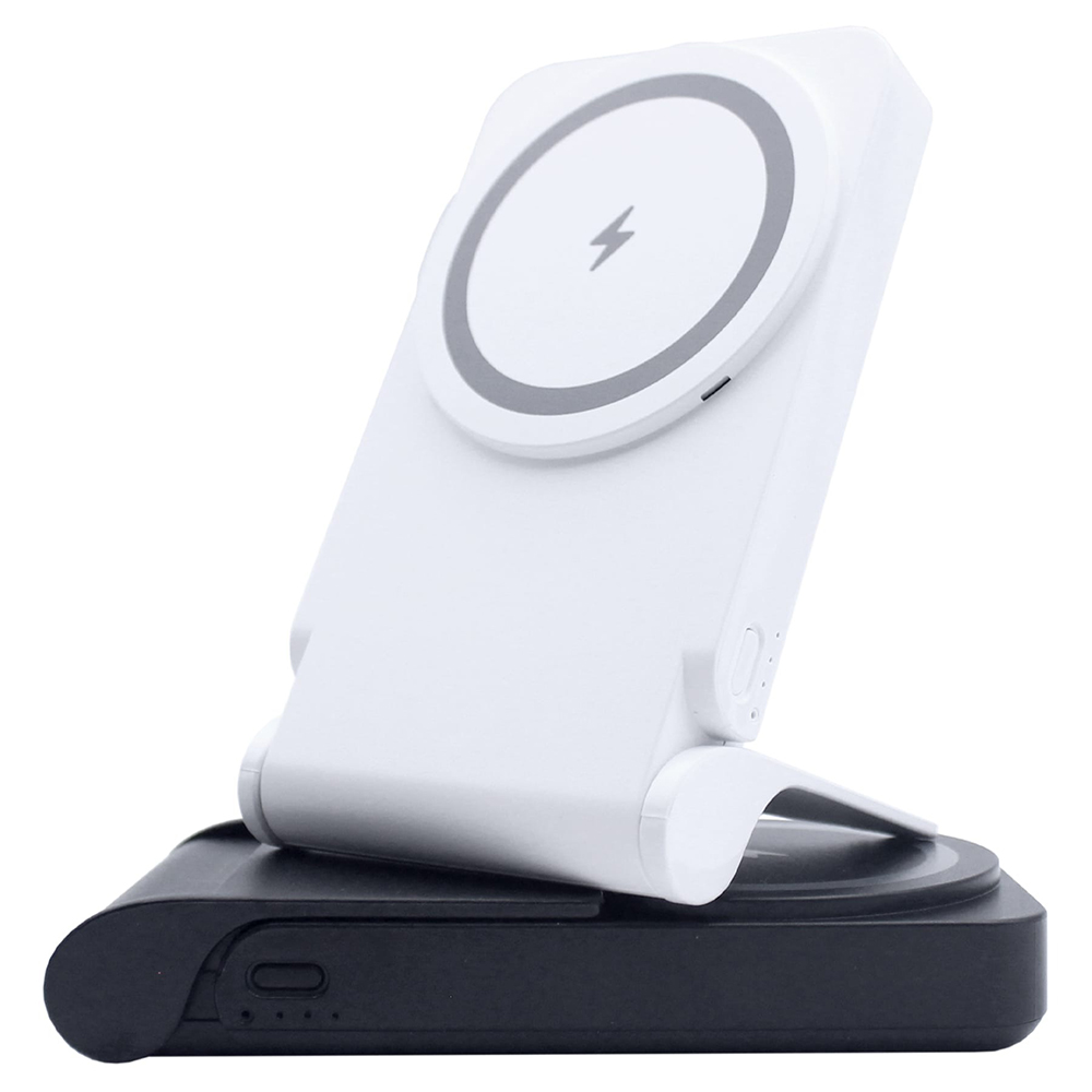 Introducing the ultimate on-the-go powerhouse - the iGo 5,000mAh MagSecure 4-in-1 Combo Charger with Stand! With MagSafe-enabled wireless charging and a built-in phone stand, this compact marvel keeps you powered up and hands-free. Effortlessly charge your device while enjoying the convenience of a sturdy stand for comfortable viewing. Stay connected wherever you are with this versatile, pocket-sized companion. Price includes full color imprint.