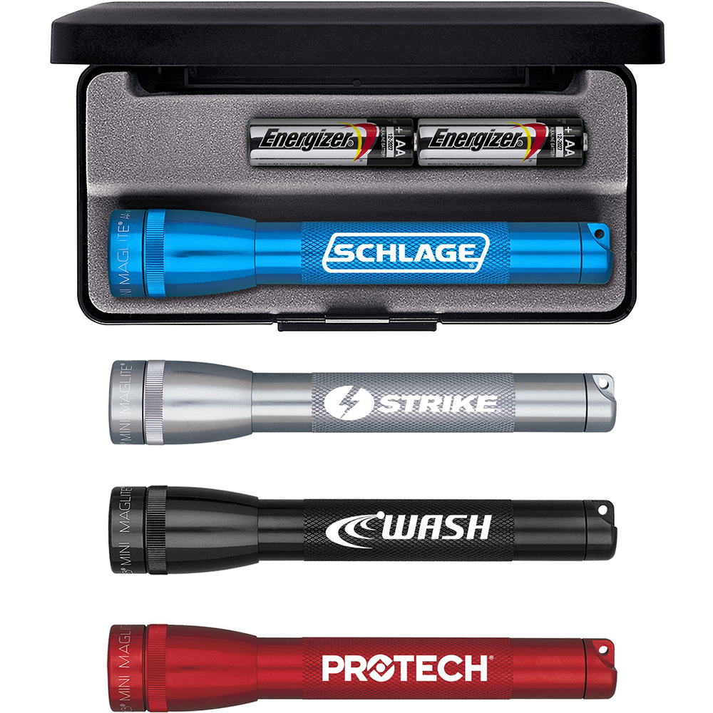 5 3/4" in length. Comes with 2 "AA" batteries and packaged in a sleek, black presentation box. Shines up to 70 times brighter than flashlights with comparable battery resources. Beam adjusts from spot to flood with the turn of the head. Converts quickly to a free standing candle mode and is water & shock resistant. Comes with a spare bulb in the tail cap. Maglite is a USA Manufacturer. Price includes laser engraving.