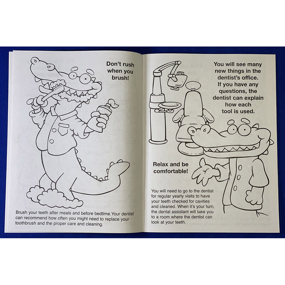 A dentist can be frightening to a child. All those tools. The sound of the drill. Ease your child's fears with the educational It's Tooth Time Coloring and Activity Book. This book features 16 pages of coloring and games, to show your child the importance of oral health, and that the dentist's office isn't so bad after all. Recommended for children ages 3 and up. Great for dentists and community dental health programs. Don't Forget the Crayons! Make it Easy -- Make it a Fun Pack: any coloring book or activity pad conveniently packaged with a 4-pack of crayons in a sealed poly bag. No assembly required. Price includes one color, one location imprint.