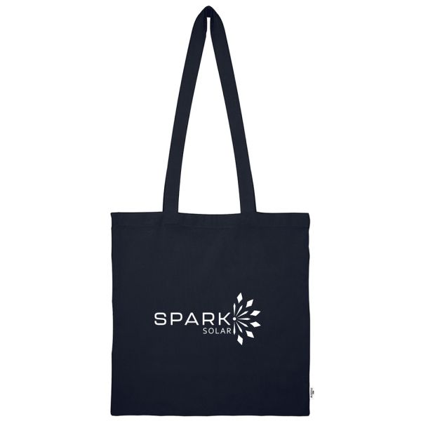 Made Of 4 Oz. Recycled 100% Natural Cotton. 140 GSM. 30" Handles. Spot Clean/Air Dry. Price includes one color, one location imprint.