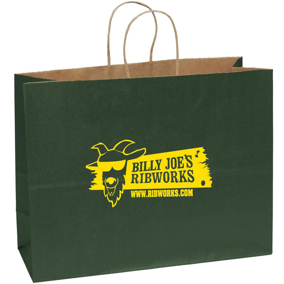 Matte paper shopper with serrated cut top and twisted kraft paper handles. Price includes 1 color foil imprint. Free Proof prior to production.