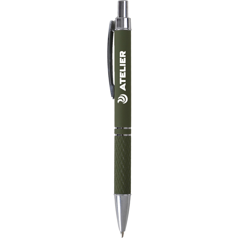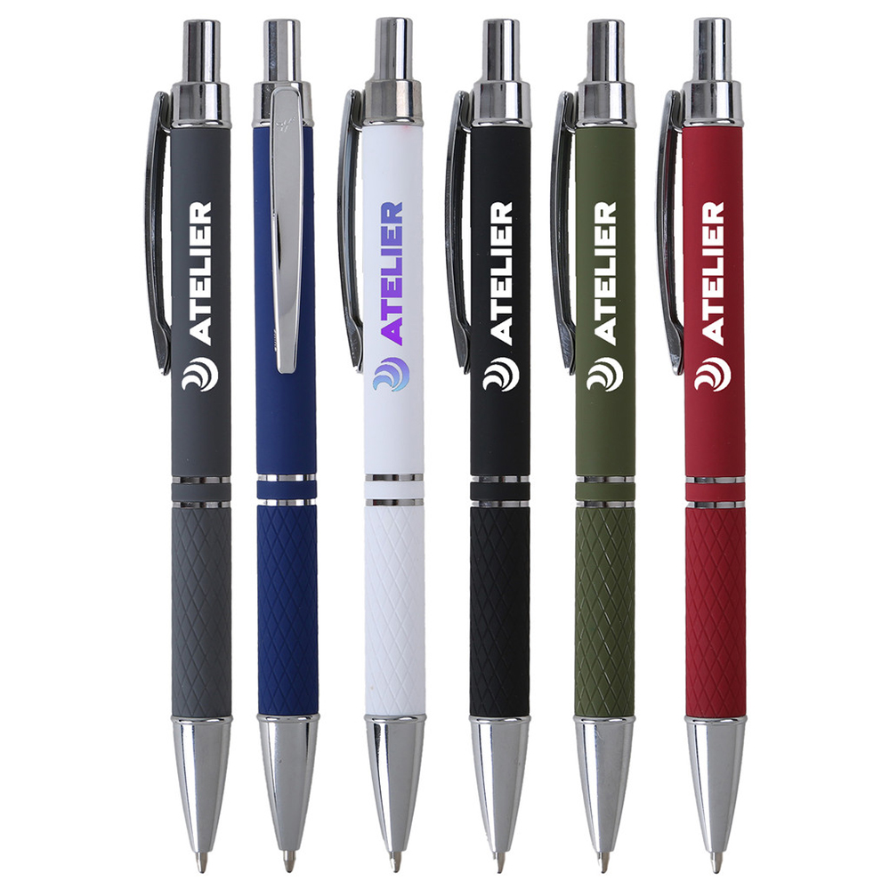 Experience executive style on a budget with the Julienne Comfort Pen! Boasting matte soft-touch barrels, shining chrome trim, and diamond-etched grip detail, this pen offers a comfortable writing experience. Make a statement with its sleek design and smooth black ink. Choose the Julienne Comfort Pen for affordable elegance and a lasting impression. Please Note: This is a plastic pen that looks like a metal pen. Matte soft touch barrels. Shining chrome trim. Diamond etch detail on grip. Smooth writing ink. Material: Plastic, Chrome. Standard Packaging: Bulk. Product Size: 5 1/2? L x 25/64? DIA. Mechanism: Push Retractable. Tip Type: Ball Point. Price includes one color, one location imprint.