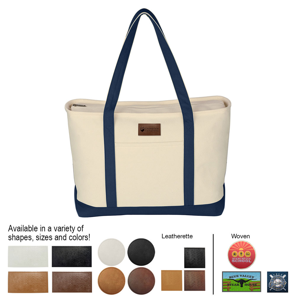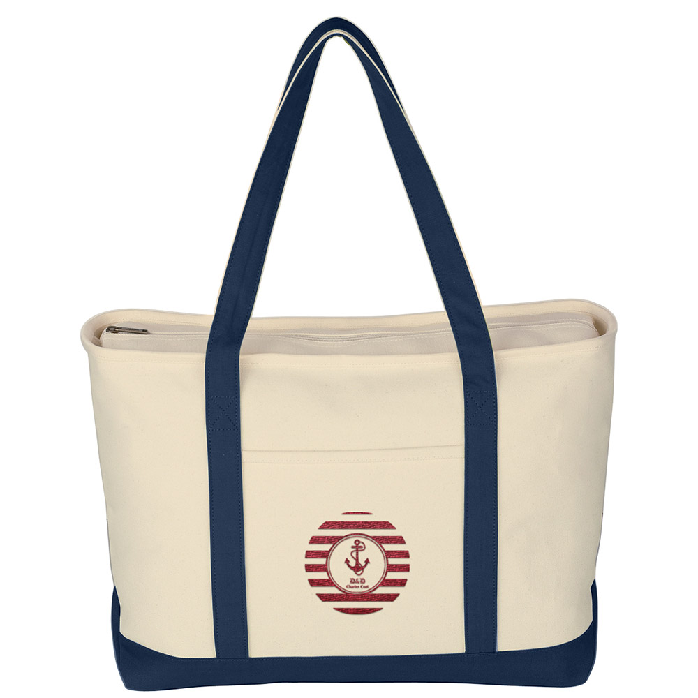 Made Of 24 Oz. Cotton Canvas. Front Pocket. Top Zippered Closure. 30" Handles. Spot Clean/Air Dry. Price includes one color, one location imprint.