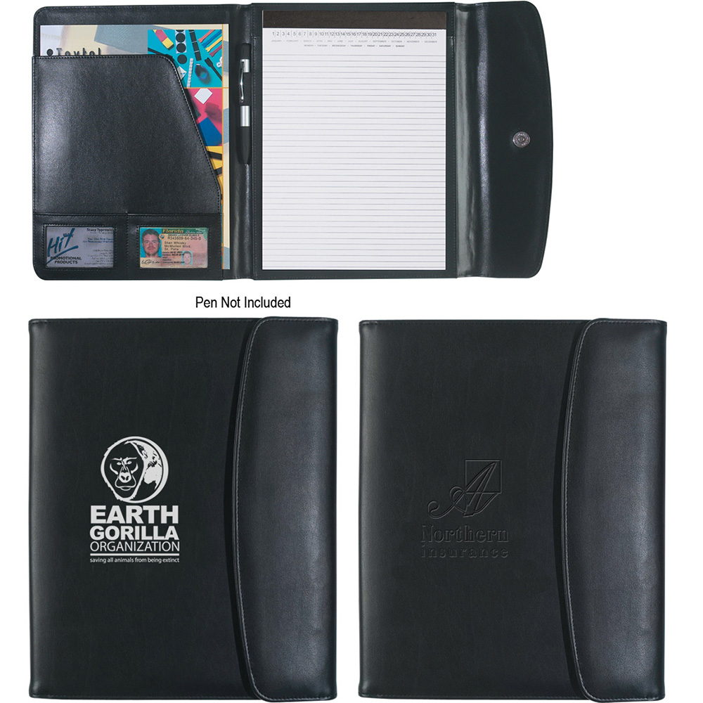 Includes 30 Page 8 - 1/2" x 11" Writing Pad. Snap Closure. Card Holders, Elastic Pen Loop, Inside Flap Pocket. Price includes one color imprint, one location.