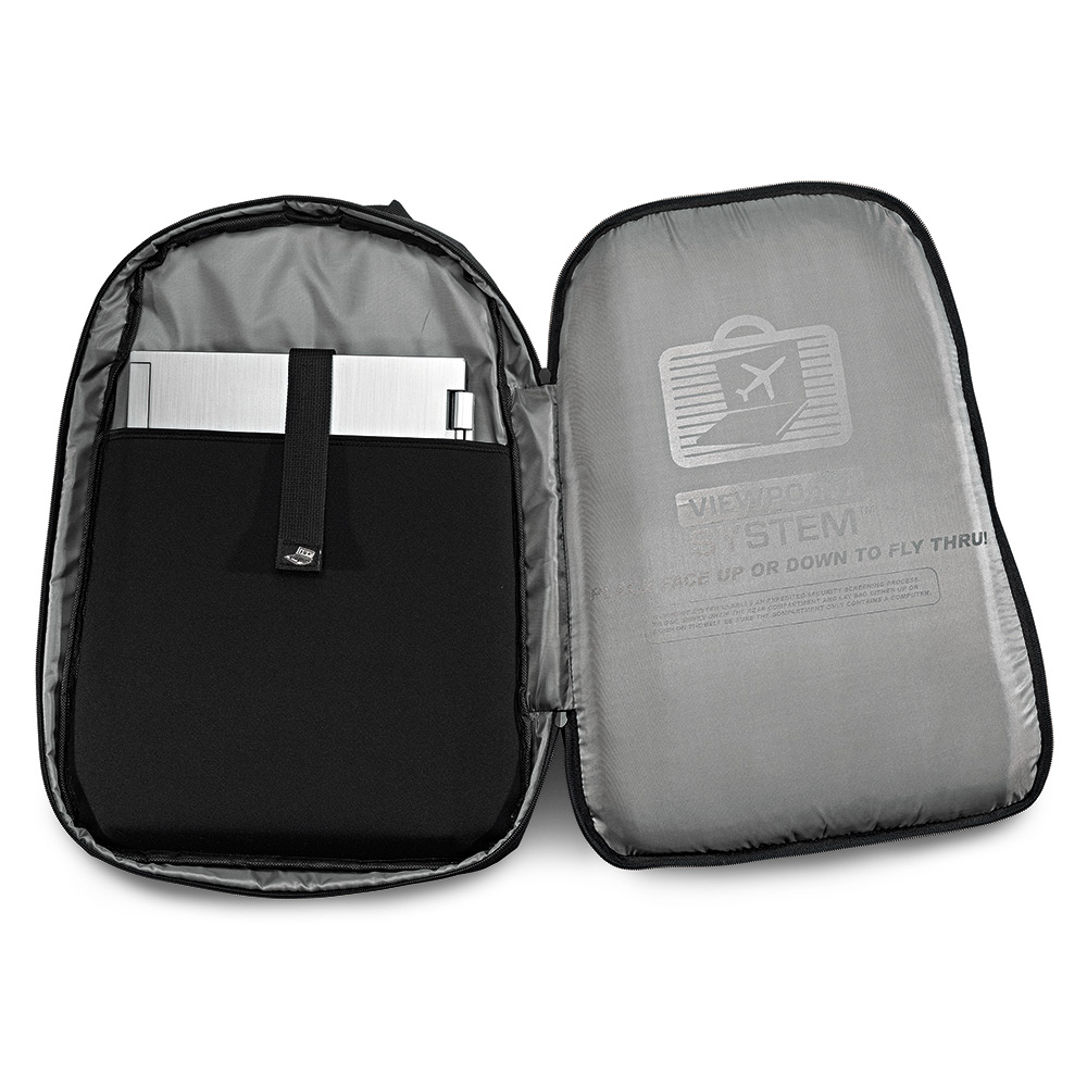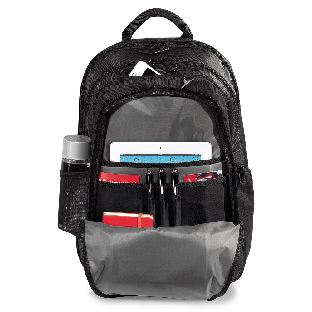 Promotional backpack with front zippered compartment with multi-function organizer and padded, scratch-resistant tablet pocket. Top zippered, scratch-resistant pocket perfect for storing a smartphone or sunglasses. Generous, zippered main compartment with mesh storage pockets. Back features Viewpoint system zippered compartment for easy scanning of laptop. Fits up to a 15" laptop. Price includes one color imprint, one location. Imprint dimensions: 4" x 3". Product dimensions: 18.5" x 8.5" x 13" - 1.70 lbs.