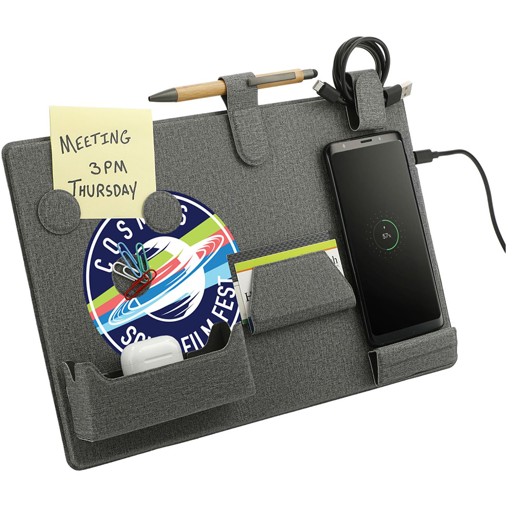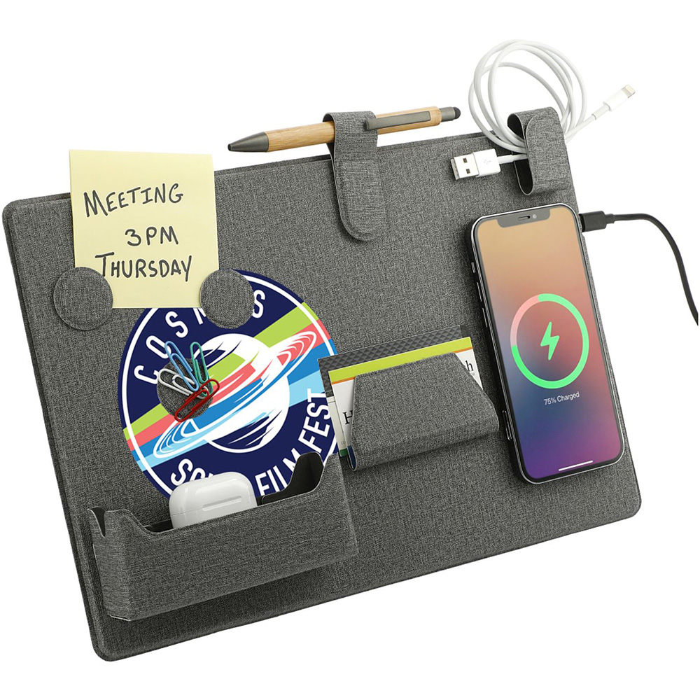 The MagClick Fast Wireless Charging Desk Organizer includes a clipboard, three magnetic docks, one foldable accessory holder, one card holder, one pen clip, one cable clip and one foldable phone stand, making it easy to organize your desk. The board has wireless charging area that magnetically attaches to iPhone 12/13/14 models for wireless charging. Using the foldable phone stand, other smartphones can be charged wirelessly. Supports three different wireless charging modes: 7.5W for iPhone 8/X/11/12/13/14 Series; 10W for Samsung Galaxy S9/S9 Plus/S8/S8 Plus/Note 8/9 and more, and 5W standard charging for all other enabled devices. Includes a 39-inch USB-A-to-Type-C charging cable. It is recommended to use a quick-charge power adapter (10W at least, not included) to achieve fast charging. Packaged in a premium gift box.