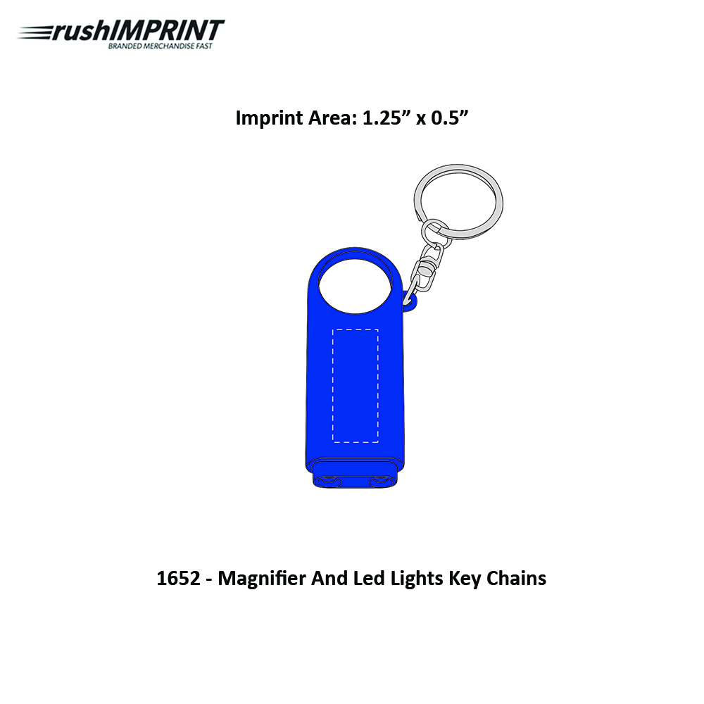 2 Extra Bright White LED Lights, Push Tip To Turn On/Off, Handy Magnifier, 2x Magnification, Split Ring Attachment, Button Cell Batteries Included.  Price includes a full color, one location imprint.