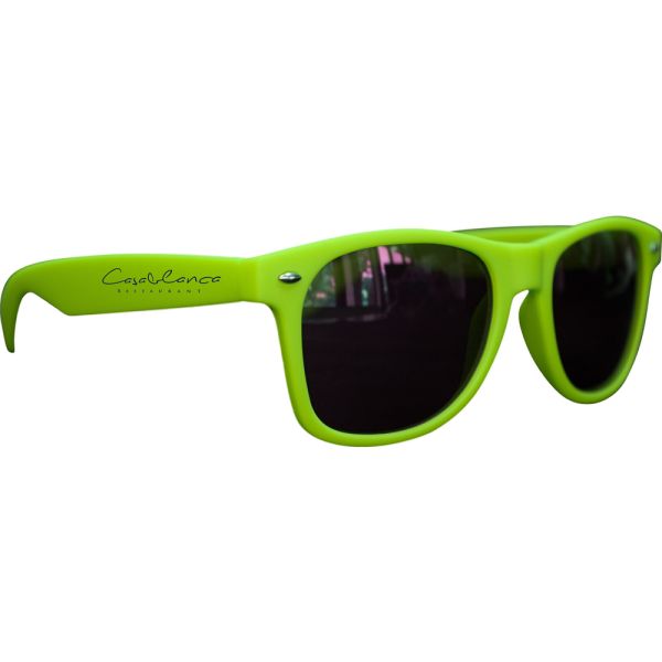 Shield your eyes from the sun in style with our Matte Soft Rubberized Miami Sunglasses. Constructed with a hard frame made from durable Polycarbonate with a soft rubberized finish, these sunglasses are 100% FDA Approved. Comes in a variety of fun colors. Makes for a high end giveaway at a great price. UVA and UVB Protection.