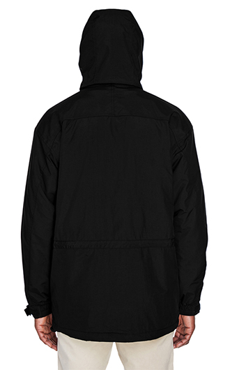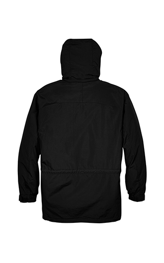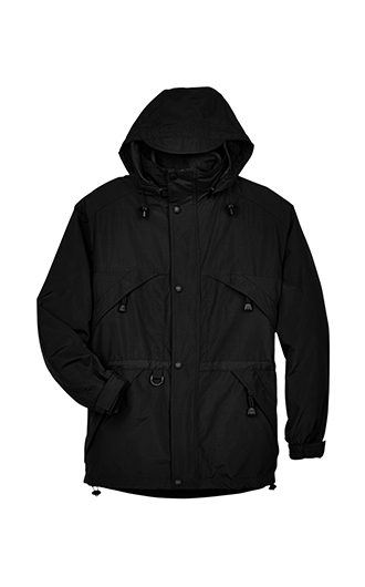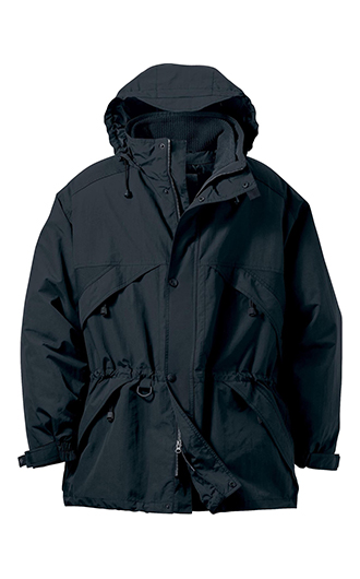 Multifunctional performance oriented 3-in-1 with waist draw cord detail and detachable jacket liner. Two upper and two lower slanted zippered pockets. Inside security zippered pocket. Elasticized cuff band with adjustable velcro tab. Adjustable elastic shockcord at hem with cordlock adjustment and shockcord holders. EZEM system. EZAWAY system features detachable zip off hood, and easy grip webbing pull tabs on storm flap and cuffs.
