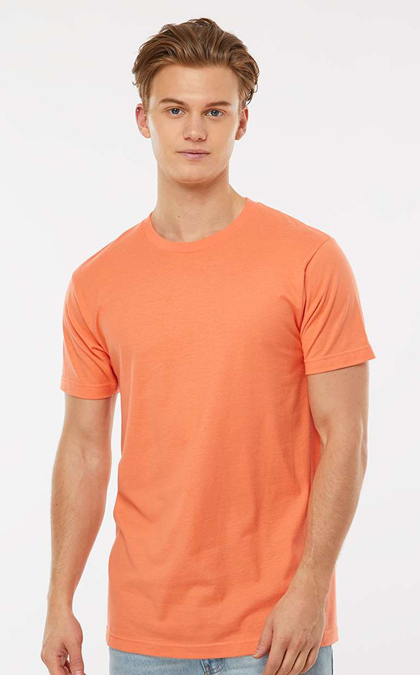 4.5 oz./yd2, pre-shrunk 100% ring-spun USA cotton, 30 singles. Heather Grey is 90/10 ring-spun cotton/polyester. Other Heathers are 50/50 ring-spun cotton/polyester. Reactive-dyed for longer lasting color. Ribbed crewneck collar. Back neck tape. Shoulder-to-shoulder taping. Side seams for sizes 4XL and 5XL. Double-needle stitching on sleeves and bottom hem. Tear away label. USMCA certified.