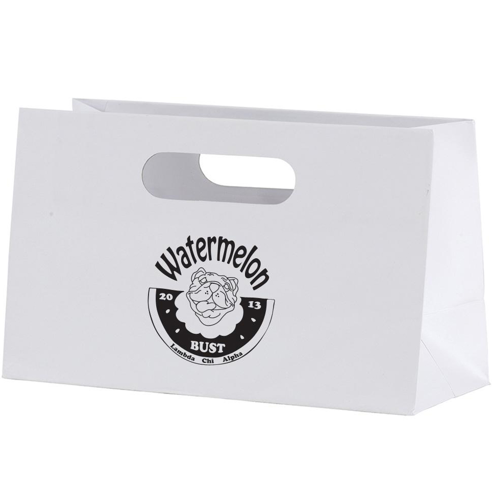 180 GSM heavyweight matte laminated bag with fold over die cut handles and cardboard bottom insert. Price includes 1 color foil imprint. Free Proof prior to production.