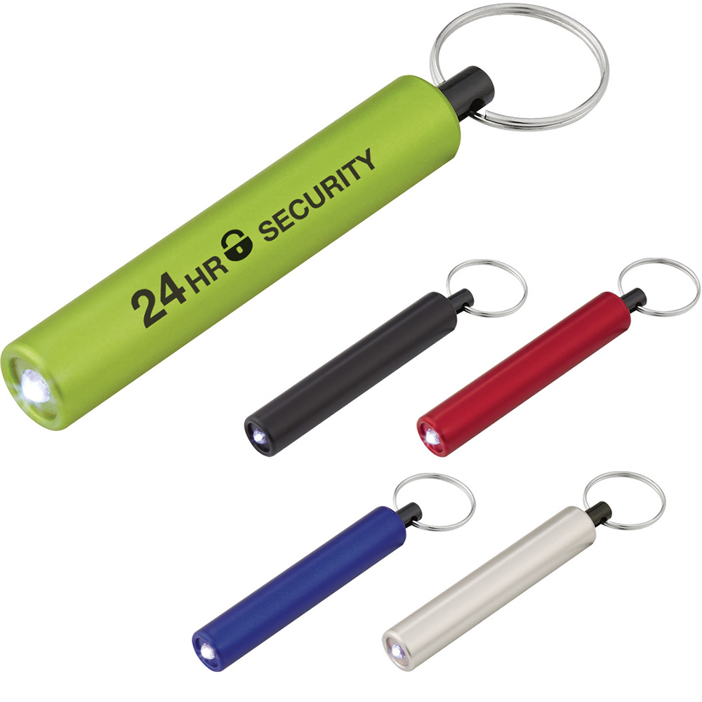 Extra Bright White LED Light. Push Button To Turn On/Off. Split Ring Attachment. Button Cell Battery Included. Price includes one color, one location imprint.