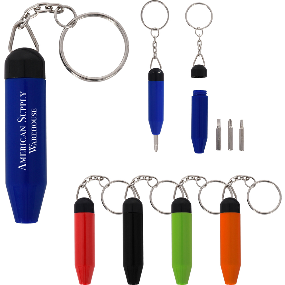 Includes Philips Screwdriver, Flathead Screwdriver and Star Bit. Magnetic Port For Accepting Bits. Split Ring Attachment. Price includes one color, one location imprint.