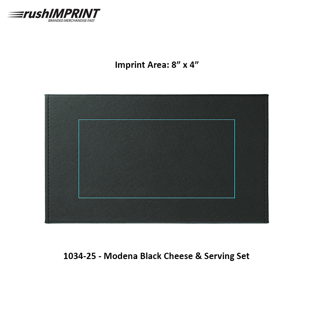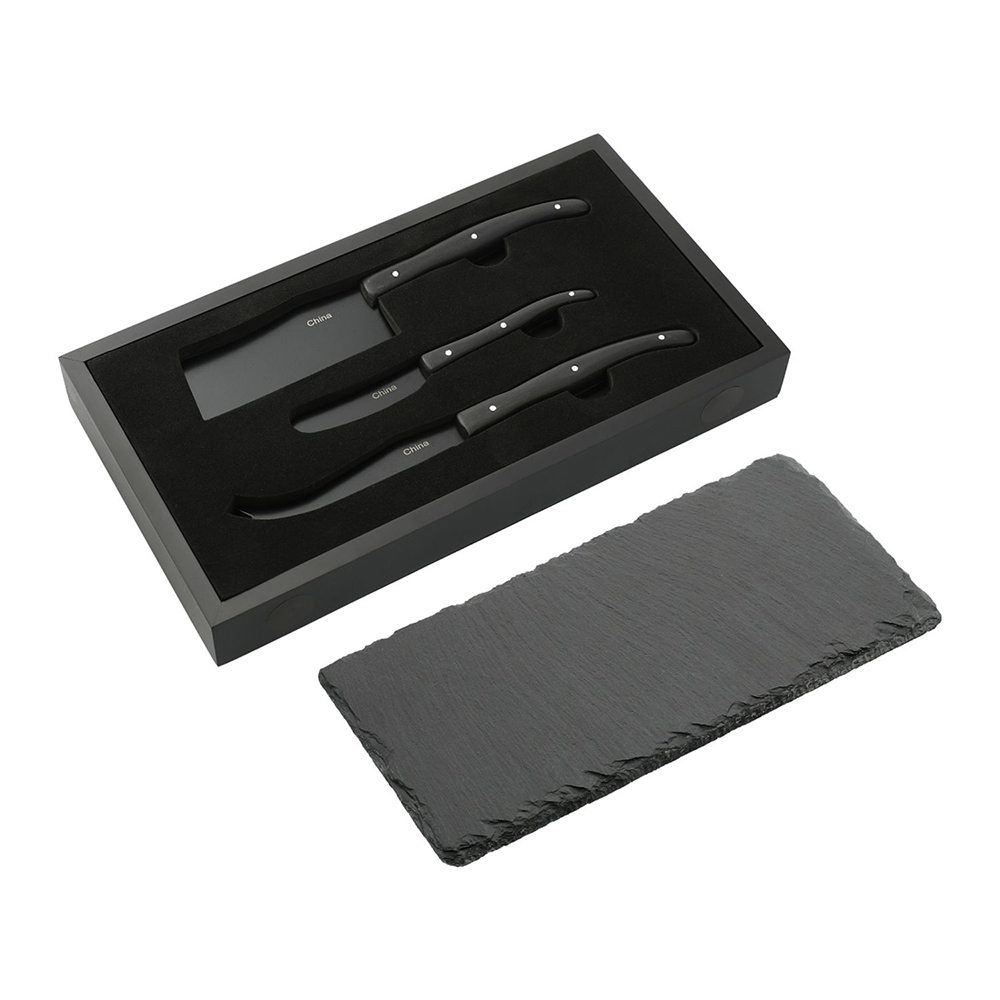 The Modena Black Cheese & Serving Set includes a slate serving board with a set of three cheese knives. This set comes in a wooden box that is convenient for both storage and presentation. The slate board measures 10.23" x 5.12" x 0.2". The knives measure 9.16" x 0.94" x 0.55" / 8.46" x 1.73" x 0.55" / 6.3" x 0.78" x 0.5". Materials: PU.