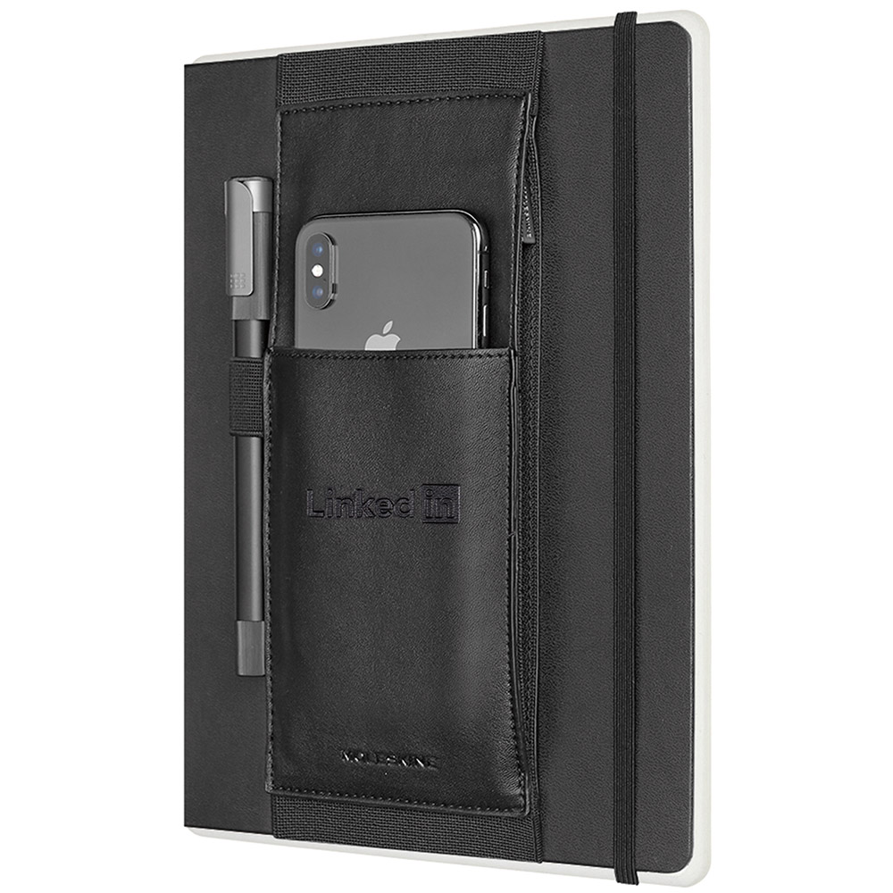 Transform your notebook and keep small objects organized and close at hand, ready to jot down ideas, plan events and increase productivity on the move> Inspired by carpenters, architects and street artists who attach tools to their waists, the Tool Belt is a neat add-on to upgrade your notebook and keep all your note-taking essentials right where you need them> Designed to fit any extra large hard cover Moleskine notebook and store the Pen+ Ellipse, Classic Click Roller Pen, or GO Pen. Front slash pocket, side zippered pocket, and internal slash pocket (front pocket can accommodate mobile devices up to a 5.5 inch display). Notebook and pen not included. Material: Vegan Leather. Price includes debossing.