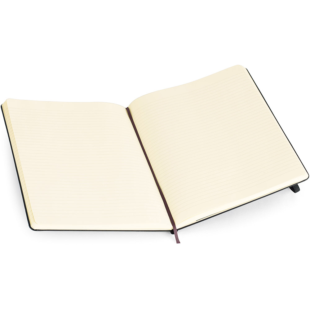 A staple tool for any professional's desk, this notebook is perfectly sized for large-format planning. Bound hard cover with rounded corners, bookmark and elastic strap closure. Ruled format. Acid-free paper. Expandable inner pocket. 192 pages (96 sheets). FSC Certified. Notebooks come packaged with a Moleskine branded ivory paper band and are individually shrink wrapped. Add a Custom Band (Item # 426), see link below! Price includes one color, one location imprint.