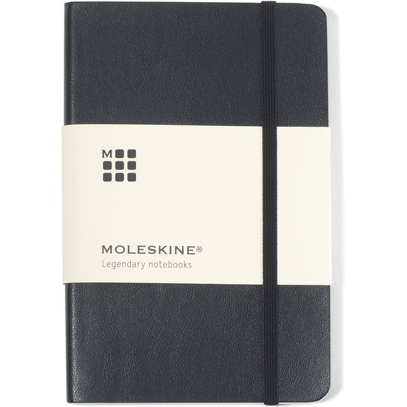Reliable travel companion perfect for notes, sketches and thoughts. Flexible, soft cover with rounded corners, bookmark and elastic strap closure. Ruled format. Acid-free paper. Expandable inner pocket. 192 pages (96 sheets). FSC Certified. Notebooks come packaged with a Moleskine branded ivory paper band and are individually shrink wrapped.Add a Custom Band (Item # 415), see link below! Price includes one color, one location imprint.