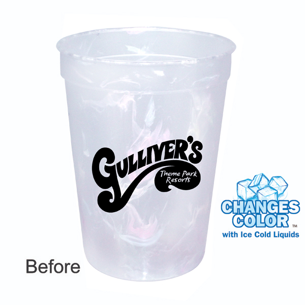 Changes color with ice cold liquids. Durable plastic. Confetti Colors: Red, Blue, Green, Purple, and Orange. Confetti pattern is different on each cup. Top shelf dishwasher safe. Optional lids available. Price includes one color, one location imprint.