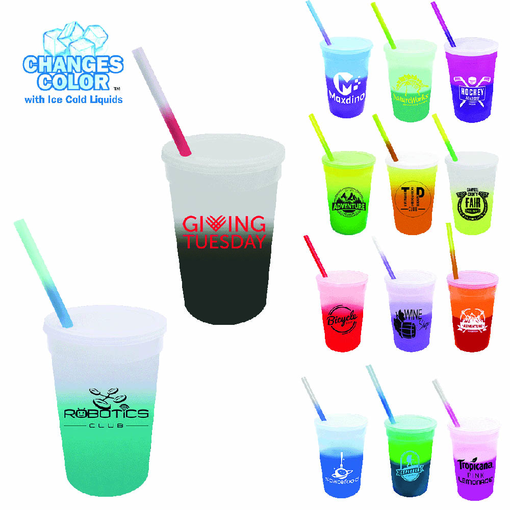 Set includes imprinted cup, frosted lid, and blank straw. Stadium cup and straw change color with ice cold liquids. Durable plastic. 15 vibrant cup colors, 8 vibrant straw colors. Lid offered in frosted. Cups and straws can be mix and matched. Top shelf dishwasher safe. Ideal for events - fun, eye-catching, and engaging. Thick and durable walls, great reusable cup. Made in the USA. Durable BPA free plastic. Price includes one color, one location imprint.