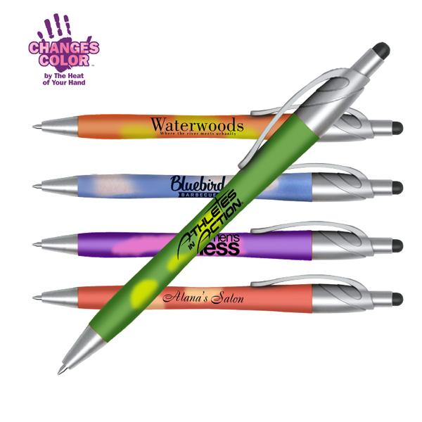 Make your logo promotion a lot more fun with this custom pen designed with barrel that changes color with the heat of your hands. Created with a stylus tip on the top of plunger. Narrow stylus for more control. Five color options for barrel. Price includes one color imprint in one location. WARNING: CHOKING HAZARD--small parts. Not intended for children under the age of 5. Free art proof will be emailed with every order within one business day. This promotional pen weighs 0.07 lbs. with imprint dimensions of 1.25x0.75 in.