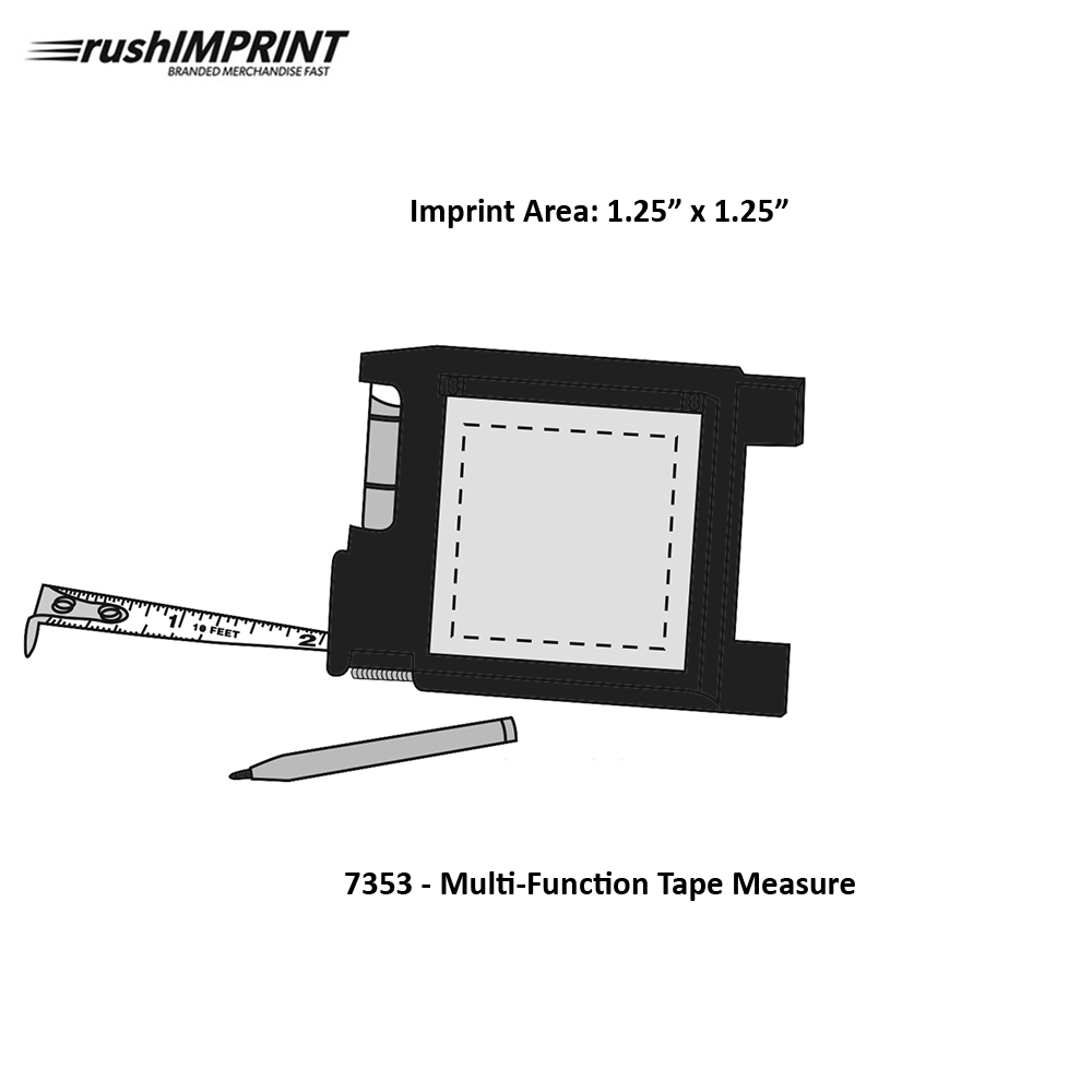 10' Retractable Steel Tape With Push Button Locking Mechanism. Metric/Inch Scale. Level. Notepad/Pen. Belt Clip. Price includes one color, one location imprint.