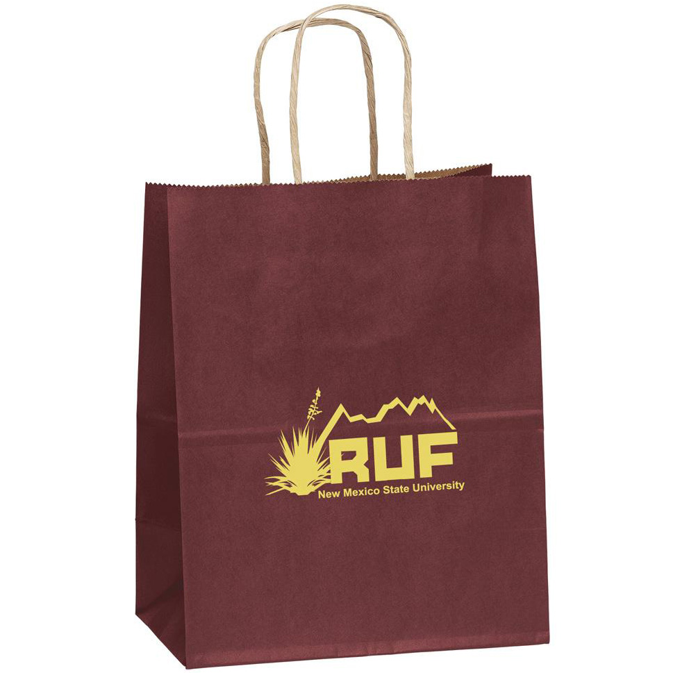 Matte paper shopper with serrated cut top and twisted kraft paper handles. Price includes 1 color foil imprint. Free Proof prior to production. Free Proof prior to production.