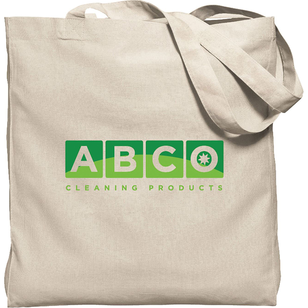 Sturdy elongated self handles that finish at 28" long. Material: cotton sheeting. Price includes full color, one location imprint.